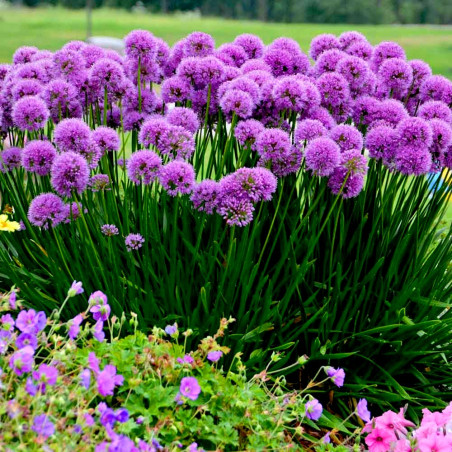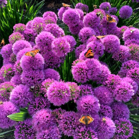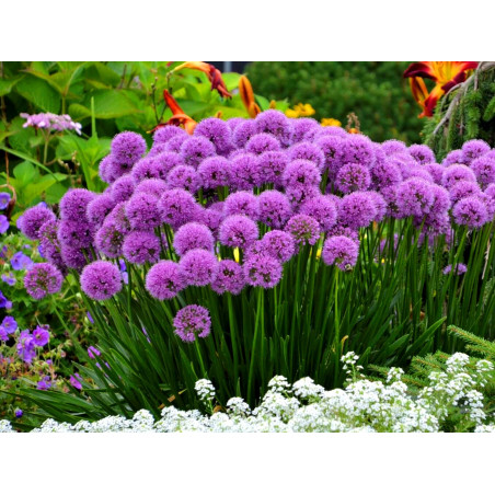 Czosnek Millenium (allium Millenium) to średniej wielkości dekoracyjna roślina do ogrodu. Charakterystyczne dla niej jest spektakularne kwitnięcie. Ten wieloletni czosnek ozdobny osiąga 30 - 50 cm wysokości, a jego szerokość ma zazwyczaj ok. 30 cm. Roślina tworzy zwarte i gęste kępy. Liście są intensywnie zielone i wąskie, a pędy proste i sztywne. Czosnek bylinowy Millenium zachwyca jednak przede wszystkim kwiatostanami. Kwiaty mają regularny, idealnie kulisty kształt o średnicy ok. 5 cm. Ich różowo-fioletową barwę można podziwiać od lipca do sierpnia. Te ażurowe baldachy na smukłych, bezlistnych i mocnych łodygach efektownie wyglądają posadzone w grupach. Doskonale komponują się z floksami czy trawami ozdobnymi. Wybierając sadzonki czosnku ozdobnego Millenium, wprowadzisz do ogrodu modny akcent i odrobinę bajkowej egzotyki. Dodatkowo imponujące kwiatostany świetnie nadają się na kwiaty cięte. Można je też z powodzeniem zasuszać i dodawać do różnych kompozycji.