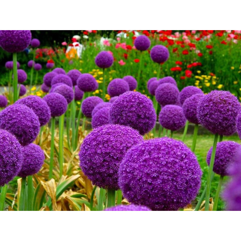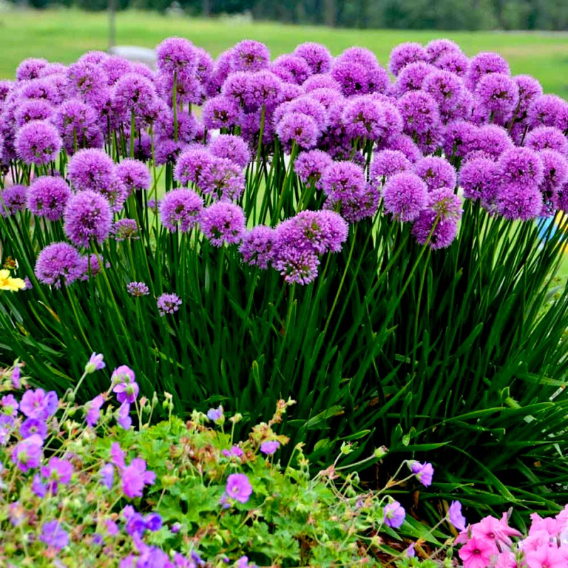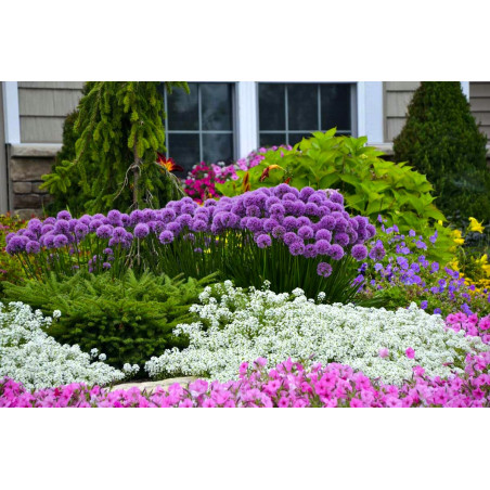 ✅ Długotrwałe, Fioletowe Kwitnienie: Wytwarza liczne, idealnie kuliste, gęste kwiatostany o średnicy około 5-7 cm, w intensywnym, jasnym odcieniu fioletu. Kwitnienie rozpoczyna się w środku lata (lipiec) i trwa nieprzerwanie do późnej jesieni (wrzesień/październik), co jest rzadkością w świecie czosnków.