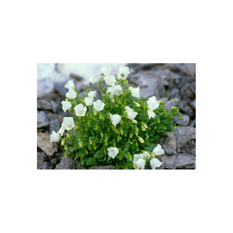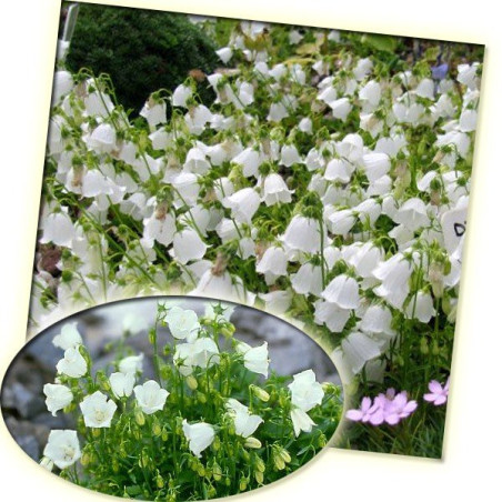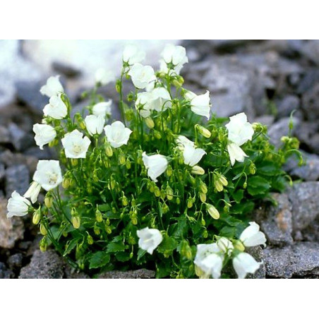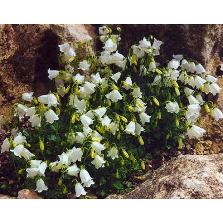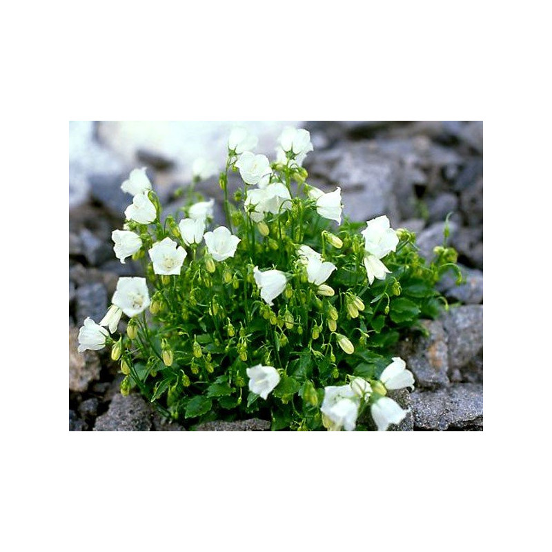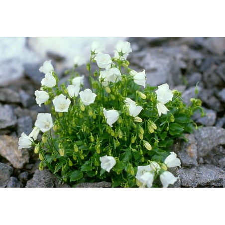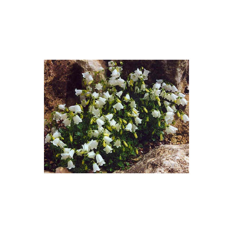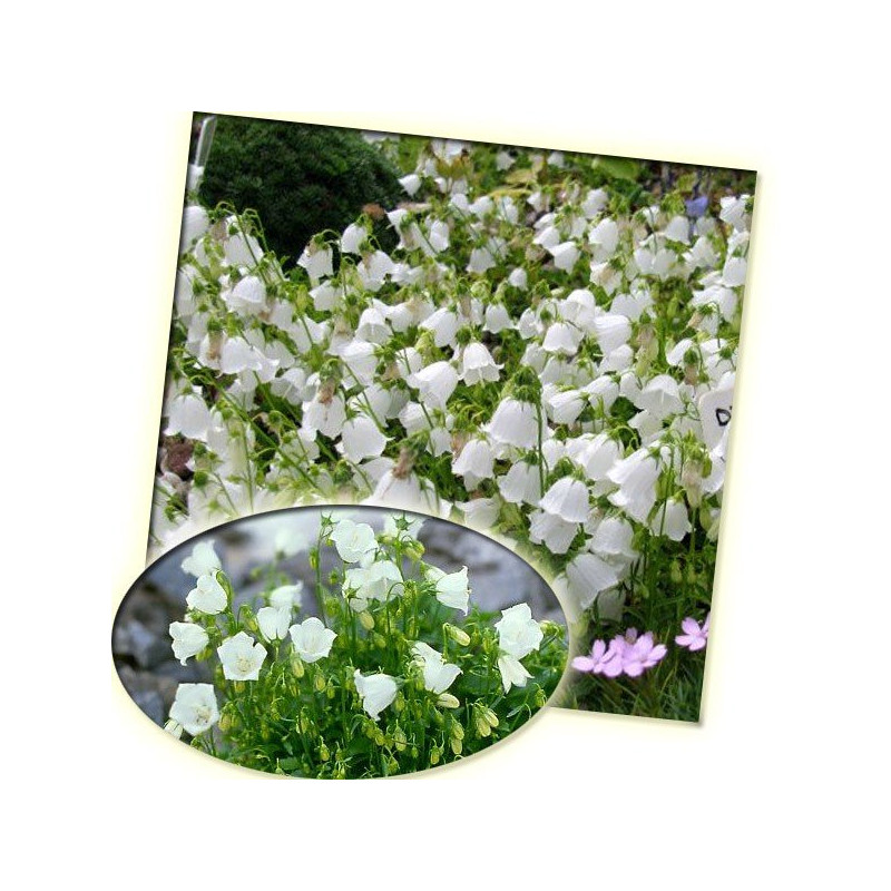 Odmiana dzwonka drobnego, o cudownych, śnieżnobiałych kwiatach.
