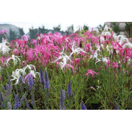 Goździk Chiński "Dancing Geisha" jest rzadko spotykaną byliną, która uwodzi swoim wyglądem oraz zapachem. Goździk może być idealna propozycją dla osób szukających nietypowych roślin do ogrodów skalnych, rabat a także do pojemników. Podczas kwitnienia możemy podziwiać kwiaty o wyglądzie podartego materiału które przy podmuchu wiatru dają wrażenie tańca. Goździk chiński kwitnie od początku czerwca do września, a więc w okresie kiedy najczęściej przebywamy w ogrodzie.Nie jest rośliną wymagającą.