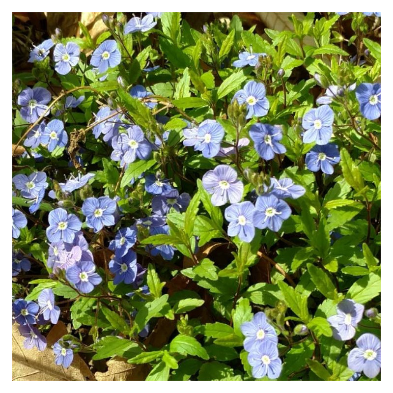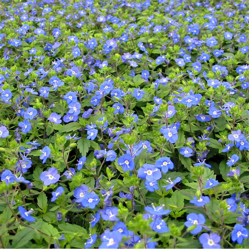1. Idealna Roślina Okrywowa i Zadarniająca: To jest jej główne powołanie. Przetacznik 'Georgia Blue' szybko tworzy niski (10-15 cm wysokości), ale bardzo szeroki (nawet 60-80 cm średnicy na jednej sadzonce) i zwarty dywan. Jego pędy łatwo się zakorzeniają w kontakcie z podłożem, co sprawia, że roślina błyskawicznie kolonizuje wolną przestrzeń. Gęsta mata liści skutecznie tłumi wzrost chwastów, minimalizując potrzebę pielenia.