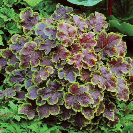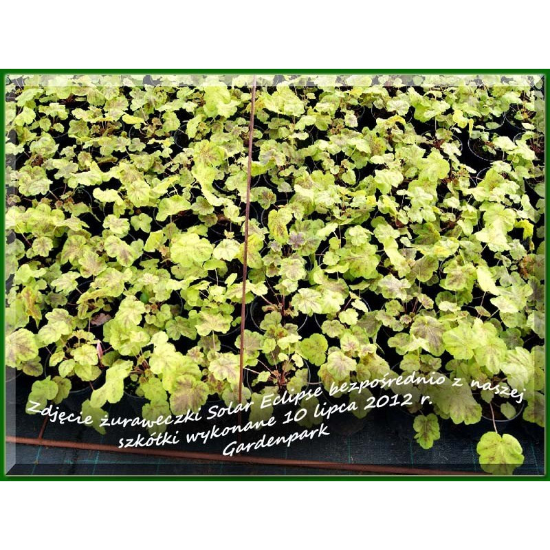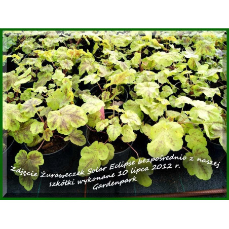 Żurawka "Solar Eclipse" to zupełnie nowa odmiana, wprowadzona na światowe rynki w 2011 roku.Dorasta do około 25 cm wysokości oraz 40 cm szerokości. Jej cechą charakterystyczną są liście szerokie z żółtym marginesem, środek liścia purpurowy, im więcej słońca tym mocniej wybarwią się liście. Kwiaty białe, obficie pojawiaja się w czerwcu. Roślina szczególnie polecana dla osób