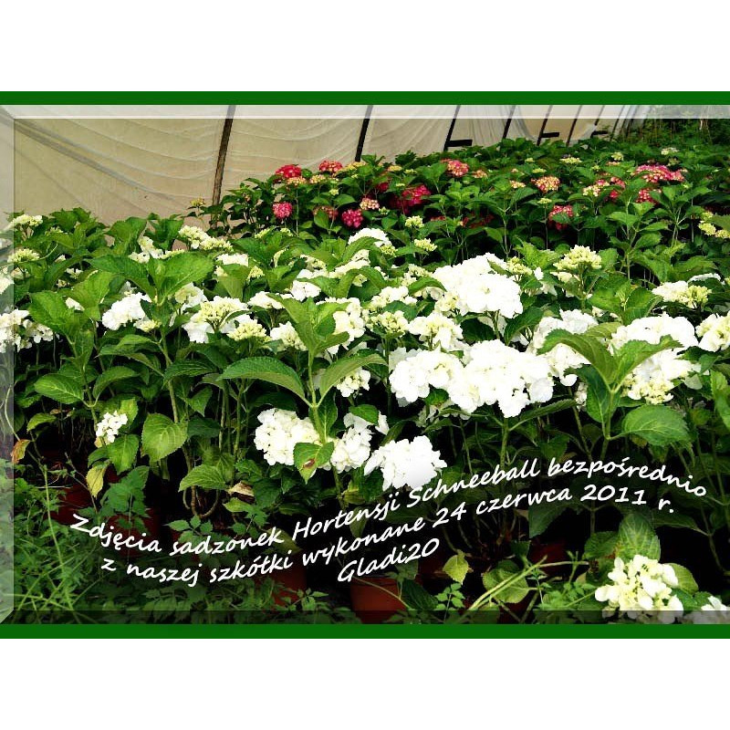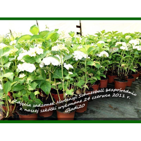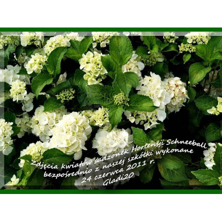 Hortensja ogrodowa "Schneeball" to jedna z najpiękniejszych hortensji dostępnych na rynku . Zaletą i cechą odmiany "Schneeball" jest brak konieczności przycinania, w wyniku czego nie pozbywamy się pędów i cieszymy się ogromną ilością kwiatów w następnym roku. Dorasta do około 100 cm wysokości więc sprawdzi się nawet w przydomowych ogrodach. Kwiaty kuliste, w śnieżnobiałym kolorze, osiągające nawet 20 - 25 cm średnicy..