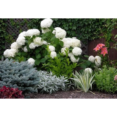 Hortensja krzewiasta 'Strong Annabelle' to wyjątkowa odmiana, która wyróżnia się ogromnymi, kulistymi kwiatostanami. Kwiaty o intensywnie białej barwie zaczynają kwitnienie latem i utrzymują się aż do jesieni, tworząc piękne, efektowne kule, które zachwycają swoją objętością. 'Strong Annabelle' jest mocniejsza i bardziej odporna na wiatry oraz opady niż tradycyjna 'Annabelle', dzięki czemu jej duże kwiatostany zawsze prezentują się w pełnej okazałości, nie opadając pod ciężarem deszczu.