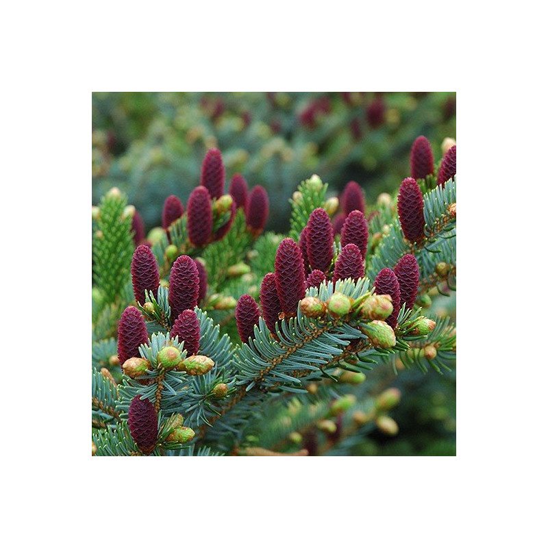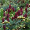 Świerk o przepięknym kolorze igieł oraz niezwykle barwnych szyszkach.