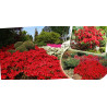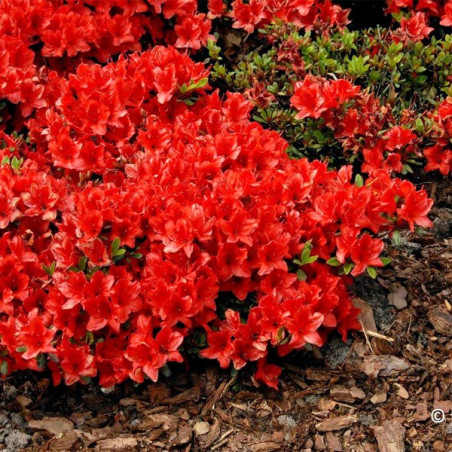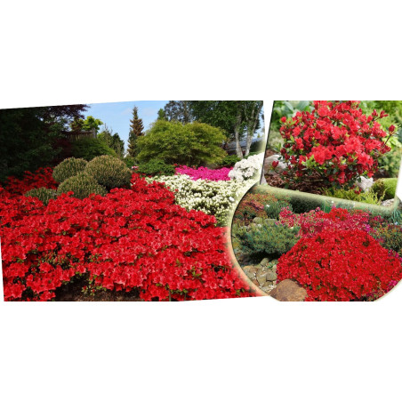 Ogniste Kwitnienie (Azalia japońska czerwona, intensywnie kwitnąca): W drugiej połowie maja, aż do czerwca, krzew niemal znika pod masą intensywnie czerwonych, aksamitnych kwiatów, często z pomarańczowym lub delikatnie bordowym akcentem wewnątrz. Kwitnienie jest tak obfite, że tworzy niezrównany efekt kolorystyczny. Kwiaty są lejkowate, nie blakną na słońcu i osiągają ok. 4 cm średnicy.