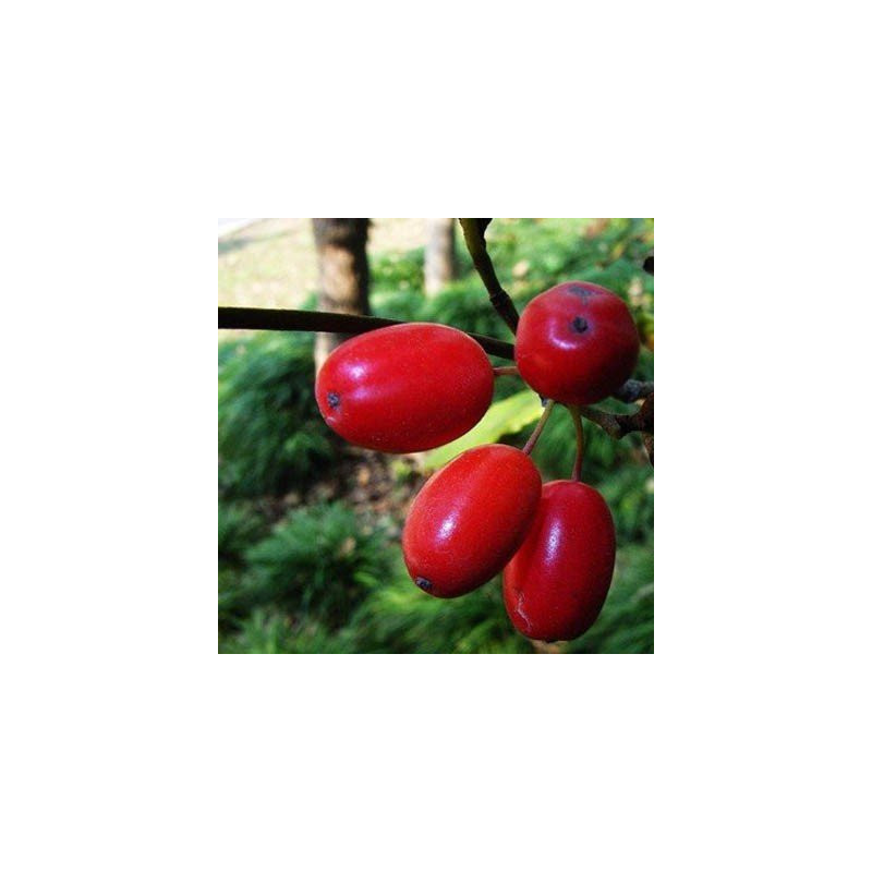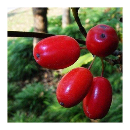 Krzew lub małe drzewo o owalnej koronie. Liście jajowate błyszczące. Dorasta do 3-4 metrów. Rośnie powoli i jest Rosina długowieczną. Kwitnie na przełomie marca i kwietnia. Drobne, żółte, intensywnie pachnące kwiaty, zebrane w kuliste baldachy, są miododajne. Owoce wielkości 2 cm dojrzewają od sierpnia do października, Można je spożywać na surowo lub po przetworzeniu ( dżemy, soki, alkohole)