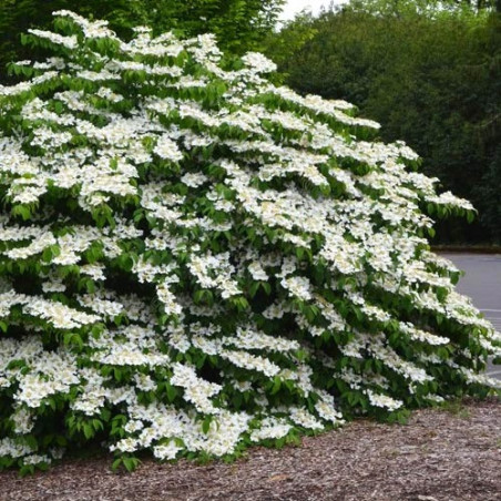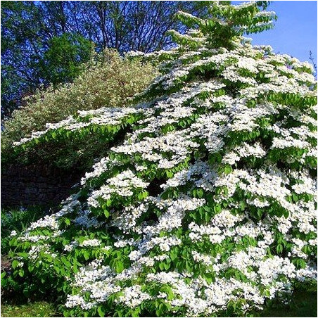 Kalina japońska "Tomentosum" to krzew dorastający do 2 metrów wysokości. Cechą charakterystyczną jest są ogromne śnieżnobiałe kwiaty w kształcie pomponów. Podczas kwitnienia krzew obsypuję się setkami kwiatów, tworząc niezwykłą kompozycję. Warto dodać, że Kalina jest bardzo łatwa w uprawie i mało wymagająca. Preferuję stanowiska półcieniste, gleby wilgotne, najlepiej próchniczne. Jest to jeden z nielicznych, tak pięknie i obficie kwitnących krzewów ozdobnych, dekoracyjny również jesienią ze względu na szkarłatną barwę liści. Kwiaty u starszych okazów osiągają nawet 20 cm. Idealnie sprawdzi się w towarzystwie Hortensji "Annabelle" i innych odmian Kalin, które są dostępne na naszych aukcjach.