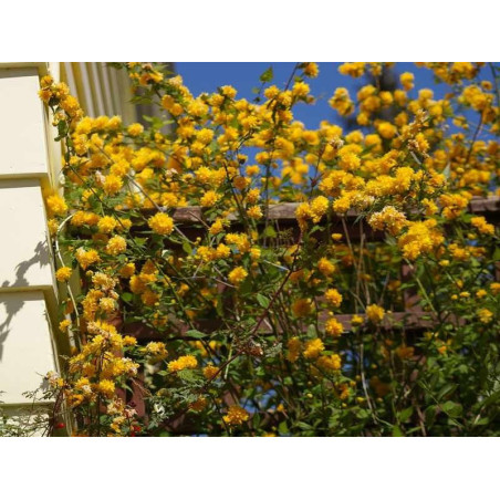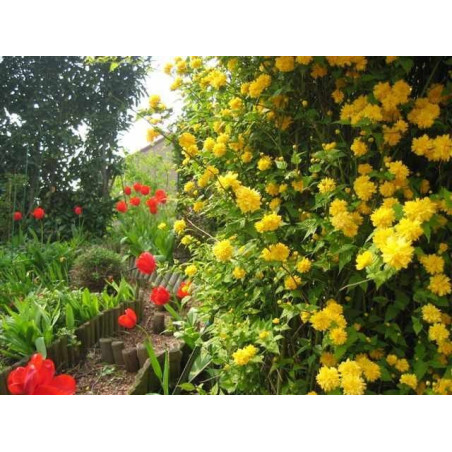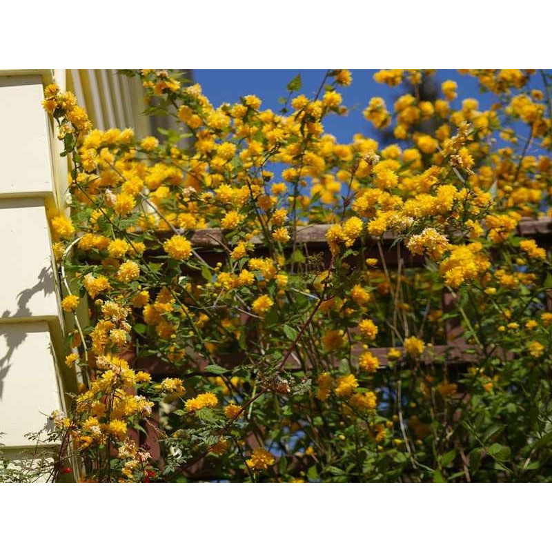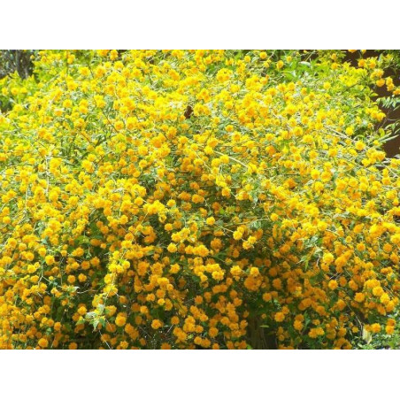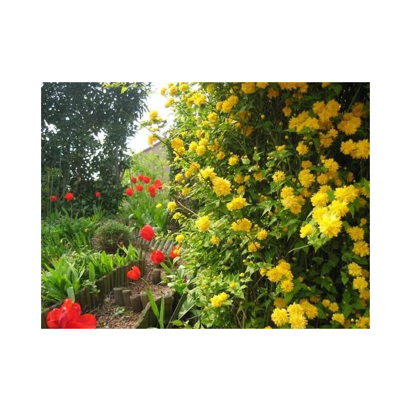 Bardzo dekoracyjny krzew pochodzący z Chin, osiągający wysokość około 2,0 m o pokroju prostym i pionowych, wzniosłych pędach. Tysiące kwiatów przypominających małe różyczki. Największym walorem dekoracyjnym tej oryginalnej rośliny są piękne kwiaty przypominające kwiaty róży w kolorze żółto - pomarańczowym i średnicy około 3 do 4 cm. Zdobią krzew przez całe lato od maja do września. Liście są ciemnozielone, o kształcie jajowatym i piłkowanym brzegu. Owoce mają postać brązowych orzeszków. Preferuje stanowiska słoneczne, choć może również rosnąć w miejscach zacienionych. Nie ma specjalnych wymagań glebowych. Najpiękniej prezentuje się w połączeniu z bylinami. Nadaje się również na żywopłot cięty. Roślina wieloletnia, łatwa w uprawie, mrozoodporna. Nazwa łacińska: Kerria Japonica Pleniflora |