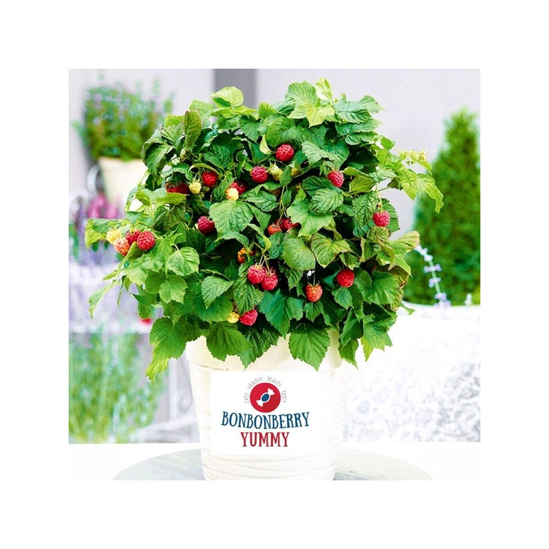 Malina właściwa 'Bonbonberry' osiąga około 50 cm wysokości. Owocuje na jednorocznych pędach. Warto wspomnieć że odmiana Bonbonberry jest odmianą bezkolcową. Owoce dojrzewają w połowie lata i utrzymują się do pierwszych przymrozków. Są owalne, lekko stożkowe, duże, żółte, bardzo smaczne, nadają się do bezpośredniego spożycia oraz do suszenia, na soki, przetwory i dodatki do potraw. Długo zachowują świeżość o zbiorze.